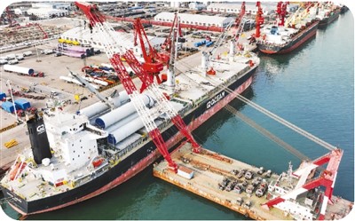 海运是中国制造业通过跨境电商出海的重要物流方式。江苏连云港针对当地风电设备制造产业发展需要,开辟风电设备出口绿色通道,帮助大批风电设备通过海运方式走向海外。图为2月22日,巴哈马籍“双吉金雀箭”货船在当地东方港务分公司码头装运用于出口的风电塔架。 |