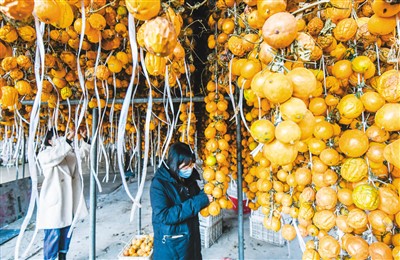 河北省遵化市农民充分利用庭院等空间种植瓜蒌,实现增收。图为近日,遵化市地北头镇农民在吊拴瓜蒌,准备晒干后外运销售。 |