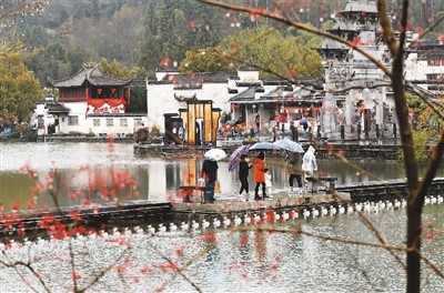 仲春时节,细雨如烟,安徽省黄山市黟县处处春意盎然,田园花海与鳞次栉比的徽派建筑相映成趣,游人徜徉其间,感受诗情画意的生态乡村。近年来,黟县着力发展“生态+旅游”产业,以建设“画里乡村”为目标,改善乡村旅游景点的生态环境,推出乡村生态旅游线路,努力实现经济效益、社会效益和生态效益相统一。图为3月24日,游客在黟县西递游览。