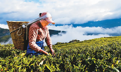 近日,云南省大理市南涧彝族自治县公郎镇罗伯克村,茶农在茶园采摘春茶。 |