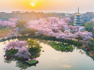 3月27日清晨,湖北省武汉市东湖樱花园在朝霞映照下,成片盛开的樱花犹如一幅画卷。