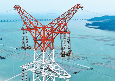 近日,福建漳州核电500千伏送出工程施工现场,施工人员在横跨1500米的漳江跨越线路百米上空进行四回线路同时跨江作业,全力推进工程进度。图为施工人员在电力钢管塔上作业。