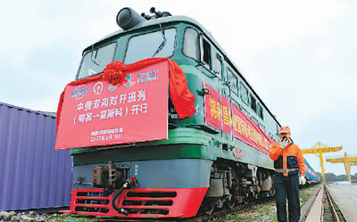 图为2022年江西首列中俄双向对开班列(南昌—莫斯科)在南昌向塘国际陆港准备出发。 |