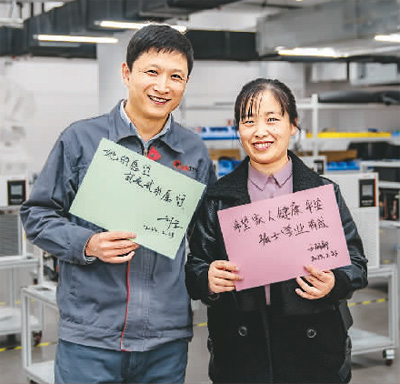 在莱伯泰科(天津)科技有限公司,刘学(左)和妻子于丽新展示他们写下的心愿。刘学曾在北京工作多年。2019年,他和妻子一起被派到天津宝坻京津中关村科技城,参与分公司的设立。现在他们一家人已经在天津落户。 |
