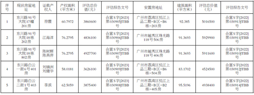 根据《广州市越秀区人民政府关于征收国有土地上房屋的决定》(越府征房〔2021〕2号),广州市越秀区人民政府决定征收越秀区东川路91号大院17幢201房、91号大院18栋202房、91号大院18栋802房,东川路白云一街6号401房、白云二街1号403房,房屋征收部门拟将越秀区珠光路118号506房、越秀区珠光路118号406房、荔湾区悦江上品二期-B区-B2栋-405房、荔湾区悦江上品二期-B区-B6栋-504房、悦江上品二期-B区-B6栋-203房用作以上被征收房屋的产权调换房屋。房屋征收部门已对上述被征收房屋及产权调换房屋进行了房地产价值评估,现将房屋的评估结果公告如图: