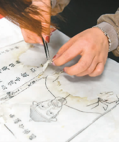 天一阁博物院的古籍修复师精心修复残损的古籍。 |