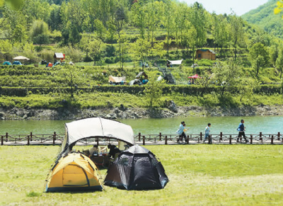 地处豫西伏牛山区的河南省洛阳市汝阳县付店镇山清水秀,依托大步湾水库发展乡村游。图为5月1日,远道而来的游客在绿莹莹的水库景区搭建帐篷,欢度假期。 康红军摄(人民视觉)