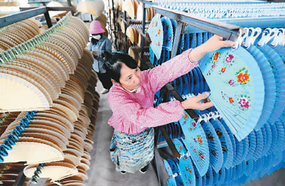 江西省抚州市广昌县甘竹镇有一批从事工艺香扇制作加工的“微企业”“微作坊”,它们在当地政府引导和扶持下,开发出工艺扇、挂历扇、折扇等20多个品种,产品远销日本、新加坡、西班牙等国际市场,带动当地村民在家门口就业增收。图为5月3日,工人在制作出口海外的工艺香扇。