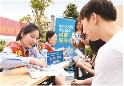 国家税务总局北海市海城区税务局日前在广西壮族自治区北海职业学院创建税费服务站,开展一系列税收宣传月活动。图为税务人员向学生讲解就业创业税费优惠政策。