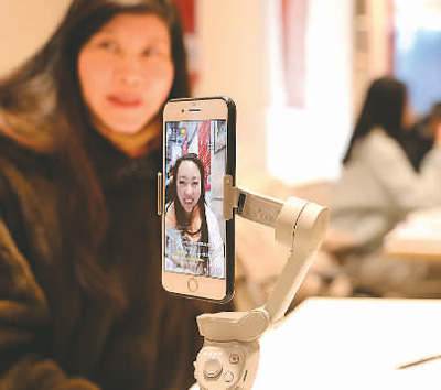 二月二十二日,北京市石景山区八宝山街道招聘会上,石景山区人力资源公共服务中心职业指导师(左)直播带岗。 |