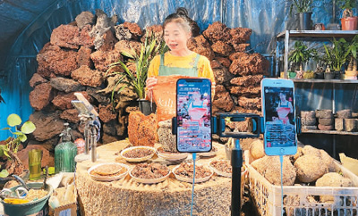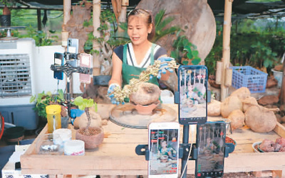 “青山绿水,来,赶紧带了这个,给您福利价格”“都是带芽芽给您发出去,收到后,芽点就噌噌噌地往上攀爬了”“特别好种好养的懒人绿植,种不死的绿植,养的好陪你到老哦”……近日,本报记者走进云南省腾冲市荷花镇甘蔗寨立茵堂种植专业合作社的直播基地,看到了一幅热旺的直播带货场景:3个紧挨的直播间里,摆满了各式各样的绿植、不同斤两的袋装土壤和火山岩制成的花盆,3名主播对着各自的手机屏幕推销手头的绿植产品。与此同时,主播们的手机上不时传来“叮”“叮”“叮”的客户下单声。