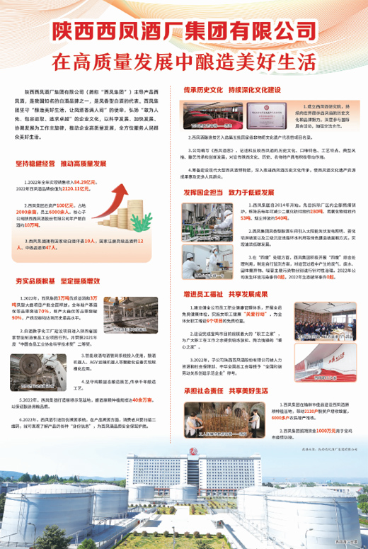 陕西西凤酒厂集团有限公司(简称“西凤集团”)主导产品西凤酒,是我国知名的白酒品牌之一,是凤香型白酒的代表。西凤集团坚守“酿造美好生活,让凤酒香满人间”的使命,弘扬“敢为人先、包容进取、追求卓越”的企业文化,以科学发展、加快发展、协调发展为工作主旋律,推动企业高质量发展,全方位服务人民群众美好生活。