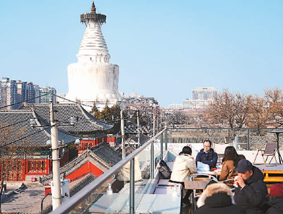 近年来,老字号纷纷开启“新玩法”。图为顾客在位于北京市西城区的老字号白塔寺药店楼顶品尝饮品。 |