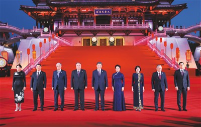 5月18日晚,国家主席习近平和夫人彭丽媛在陕西省西安市大唐芙蓉园为出席中国—中亚峰会的中亚国家元首夫妇举行欢迎仪式和欢迎宴会。宴会后,习近平夫妇同贵宾们共同观看中国同中亚国家人民文化艺术年暨中国—中亚青年艺术节开幕式演出。这是习近平夫妇在紫云楼前同贵宾合影留念。 |