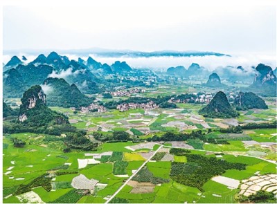 近日,在广西壮族自治区贺州市平桂区鹅塘镇锦塘村,绿油油的稻田与远处的峰林、云海相映成趣,构成一幅美丽的山水田园画卷。