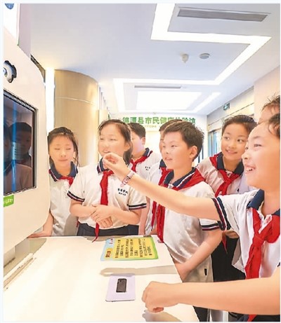 近日,浙江省湖州市德清县舞阳学校千秋校区开展“营养与健康”主题教育活动,组织学生走进市民健康体验馆,通过裸眼3D多媒体互动、VR模拟体验、营养健康科普等形式,向孩子们传递科学饮食、均衡营养的理念。图为在德清县市民健康体验馆,小学生通过体验裸眼3D人体探秘,了解人体八大系统的相关知识。