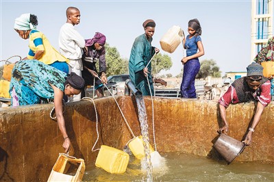 自4月以来,塞内加尔马塔姆地区长期保持高温,太阳直射下地表温度可达50摄氏度,解决牲畜饮水问题成为当地人们日常生活的一项难题。图为人们在马塔姆地区隆贝勒拉纳一处供水点打水。