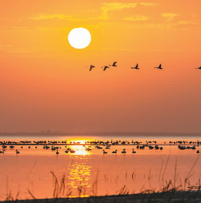鸟群沐浴着夕阳。 |
