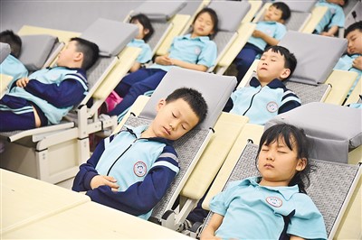 近年来,河北省邯郸市复兴区先后投入360余万元,购置躺式桌椅、固定床、折叠床、睡垫,解决孩子餐后睡眠的难题。图为5月29日,在复兴区百花第二小学,学生们使用“躺式课桌椅”午休。 |