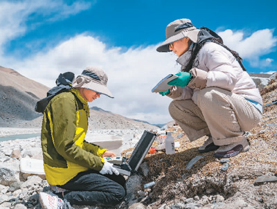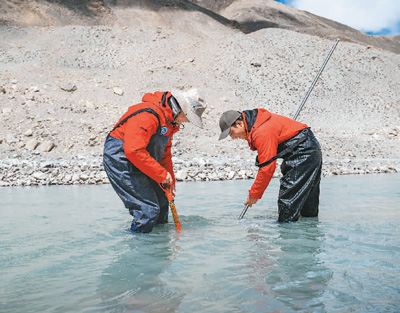 珠峰登山大本营附近,来自西藏大学生态环境学院的科考队员在收集水生生物样本。 |