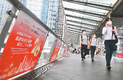 香港回归祖国26周年庆典日将至,香港大街小巷庆祝氛围渐浓。图为6月14日,香港市民路过展示庆祝海报的中环天桥。