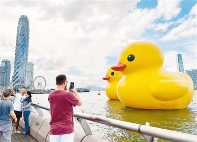 “香港,我们回来了!”展览主办方在官方网站中写道,“橡皮鸭也很想念香港,这个夏天终于能与大家再次相聚于维港。”夏日的暖阳里,两只“小黄鸭”的金色倒影在粼粼的波光中泛起涟漪,散发着艺术力量,也温暖着人们的心。