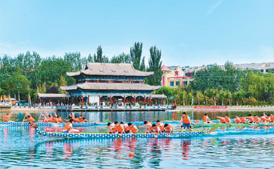 6月21日,甘肃省敦煌市十一届龙舟大赛在党河风情线景区举办。图为代表队队员在比赛中。 王斌银摄(人民视觉)