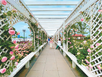 山东青岛胶州市近年来建设了一批街头公园、口袋公园、小区游园,既优化了生态环境,又满足了市民休闲娱乐的需求。图为市民在公园内赏花游玩。