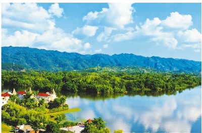 近年来,重庆市梁平区持续推进湿地保护修复各项工作,生态环境持续向好,向着天更蓝、地更绿、水更清、城市更宜居的目标不断迈进。图为6月25日,梁平区双桂湖国家湿地公园,蓝天白云与湿地、城市交相辉映。