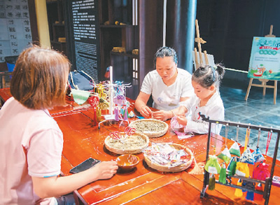 端午节假期,在湖南省汨罗市屈子祠镇屈子文化园内,游客正制作香囊。 |