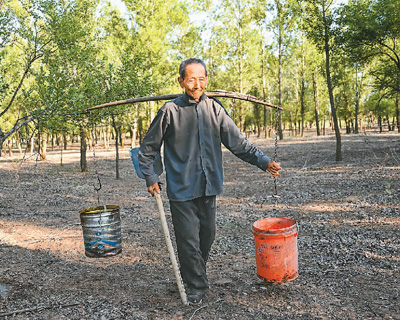 曹扎娃担水准备给树苗浇水。 |