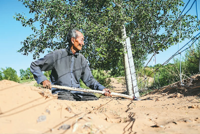 曹扎娃在他的承包地边界上铲沙加固围栏,防止牛羊进入林地。 |