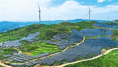 南方电网贵州电网公司依托数字电网建设,加快构建以新能源为主体的新型电力系统,推动贵州多能互补电源体系建设。今年1至5月,全省累计消纳新能源99.83亿千瓦时,同比增加19.83%,新能源日发电量最高达2.17亿千瓦时。图为在海拔1300多米的贵州省松桃县磐石镇黔东草海高坡上,由47个光伏区方阵组成的7000余块光伏板在阳光下熠熠生辉,25座巨型“大风车”迎风旋转,清洁电力正源源不断从这里顺着电网输送到千家万户。