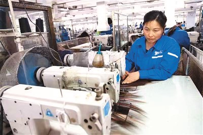 在许昌市建安区富鑫发制品公司的厂房内,机器轰鸣,一片忙碌。工人刘清香正在进行织发作业,她熟练地将乳白色网帽抻在假头模型上,左手将头发放在网帽的细缝上,右手指捏紧一根笔芯大小的钢针,上下游走,黑色头发渐次镶在网帽上。很快,一件制作完成的假发头套顺利下线。