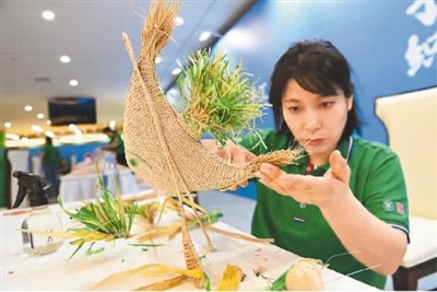 以“塑匠心育人才,强产业促振兴”为主题的第一届全国农民技能大赛日前在山东聊城落下帷幕。来自31个省(区、市)和新疆生产建设兵团的300名农民选手围绕手工刺绣、手工编织、手工剪纸、泥塑、面花制作、农民画等6个比赛项目展开角逐。图为选手参加手工编织项目比赛。