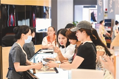 今年上半年,海南离岛免税店总销售额323.96亿元,同比增长31%;总销售额中,免税销售264.84亿元,同比增长26%;免税购物人数516.6万人次,同比增长34%;免税购物件数2568.23万件,同比增长5.8%。图为7月5日,在中免集团海口日月广场免税店内,顾客正在挑选免税商品。
