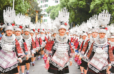 苗族姑娘参加贵州省台江县苗族姊妹节盛装巡游。 |