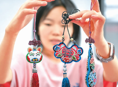 多彩贵州文化产业投资集团的工作人员在展示苗绣文创产品。 |