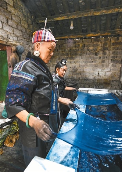 在贵州省台江县萃文街道仰黎坊,苗绣传承人潘玉珍(前)与女儿在染布。 |