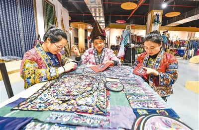 在贵州省从江县美娥社区易地扶贫搬迁安置点的刺绣公司里,绣娘们正在刺绣。 |