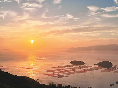 霞浦县花竹村日出时分,海天鎏金,近海岛屿星罗棋布,与渔排、渔船在朝阳中交相辉映,美轮美奂。 |
