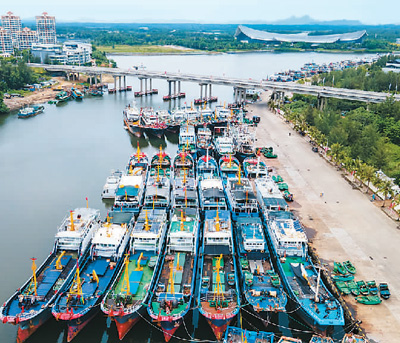 为应对即将登陆的今年第4号台风“泰利”,海南省琼海市潭门港大批渔船停靠港湾。