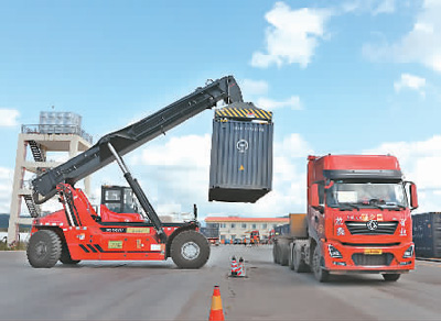 图一:图为在位于云南省景洪市境内的中老铁路野象谷站货场,工人吊装集装箱。 |