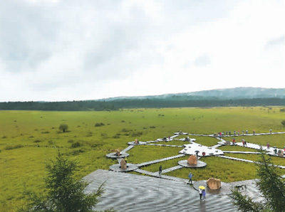 七星湖的活泡子、沼泽、草场、草甸与森林紧密相连。景区有座三层回廊式瞭望台,站在第三层,凭栏北望,是无尽的墨绿色林海,莽莽苍苍,一阵风吹过,林海的树梢在摇曳,像海上的波涛在翻滚。