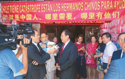 图为王何兴(中)在捐赠救灾后接受智利当地媒体采访。 |