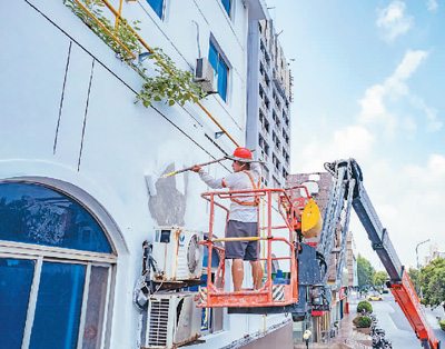 今年以来,江苏省宿迁市宿城区积极推进老旧小区改造提升工程,着力开展并实施外墙立面修复、屋顶漏水修复、绿化补植提升等改造内容,为群众打造更加安全宜居的家园。图为宿城区幸福街道东大社区一老旧小区内,工人正在粉刷外墙。