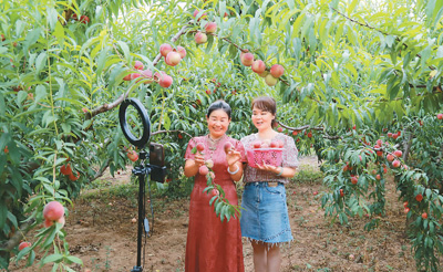 甘肃省陇南市徽县泥阳镇举办“福地乔王、花果之乡”采摘节活动,赏田园风光、摘瓜果体验,促进当地盛产的红桃、脆李、葡萄等水果通过线上线下相结合的方式销售到全国各地。图为泥阳镇乔王村“新农人”王海燕(左)与电商主播在采摘节上直播网销红桃水果。 |