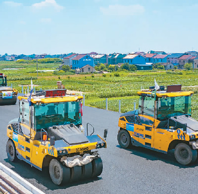 在浙江交通集团杭甬复线宁波一期项目浙江省慈溪市周巷段施工现场,由1台摊铺机、6台压路机组成的“无人驾驶施工集群”在进行沥青摊铺施工。 |
