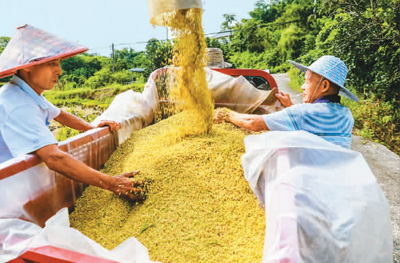 盛夏时节,四川省泸州市合江县51万亩水稻陆续成熟,当地村民抢抓晴好天气进行水稻收割、转运等作业,保障粮食颗粒归仓。合江县是全国粮食生产大县,也是四川水稻栽插最早的地方。图为合江县白米镇斗笠村村民在抢收水稻。