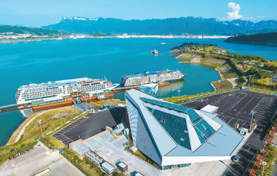 三峡大坝上游的湖北省宜昌市秭归县旅游港换乘中心建设近日进入收尾阶段,即将投入运行,标志着具备年游客通过能力240万人次的长江三峡宜昌至重庆的始发港和终点港将全面建成。该港是湖北省三大旅游母港之一,也是整个长江旅游经济带的重要节点。图为日前拍摄的三峡秭归旅游港换乘中心建设现场。